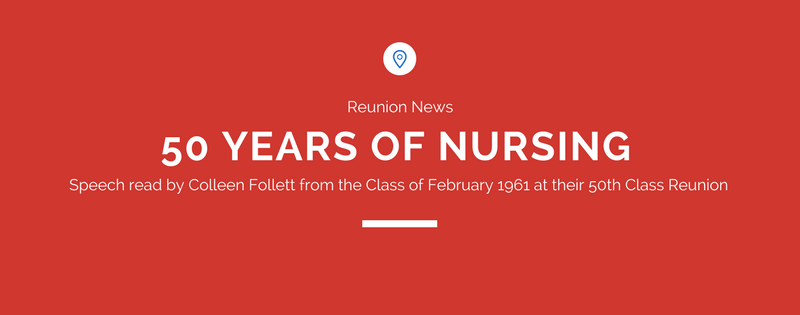 This speech was read by Colleen Follett from the Class of February 1961 at their 50th Class Reunion during the annual VGH School of Nursing Alumane Luncheon on May 1, 2011.We are sure you will relate to her words!