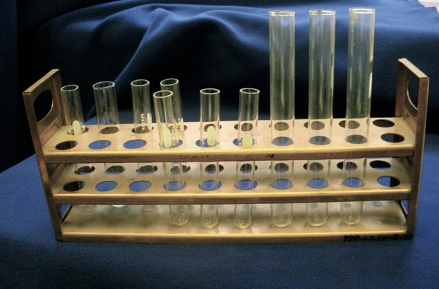 Collection Nursing Equipment Collection Item Copper Test Tube Holder and Test Tubes 998.63.1a-k Download Core Metadata LabelCopper Test Tube Holder and Test TubesDescriptionCopper test tube holder (.1a), containing nine glass test tubes (.1b-k).Sub-CollectionGlassware Museum Information Museum Item Identifier998.63.1a-kAccession Number998.63.1a-kLocationMuseum CabinetYear Accessioned1998 Continue browsing Two Erlenmeyer Flasks with Rubber Suction Tubing Cleft Palate Nipple with Instructions Back to items list