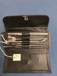 Collection Nursing Equipment Collection Item Pocket Instrument Holder 2018.4.6a-e Download Core Metadata LabelPocket Instrument HolderDescriptionA black tri-fold instrument holder (.6a) for long, slim tools, a variety of which (.6b-e) are included.Sub-CollectionForceps, Scalpels, and Scissors Museum Information Museum Item Identifier2018.4.6a-eAccession Number2018.4.6a-eYear Accessioned2018 Continue browsing Hypodermic Syringe with Cleaning Wires Pocket Thermometer Pouch Back to items list