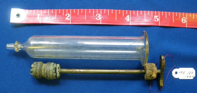 Collection Nursing Equipment Collection Item Syringe in Holder with Rubber Stopper 998.137.16a-b Download Core Metadata LabelSyringe in Holder with Rubber StopperDescriptionGlass syringe in holder (.16a) and rubber stopper (.16b).Sub-CollectionGlassware | Syringes and Needles Museum Information Museum Item Identifier998.187.16a-bAccession Number998.187.16a-bLocationMuseum CabinetYear Accessioned1998 Continue browsing Rounded MacBick Beaker, 2000 mL Glass Suction Bottle Back to items list