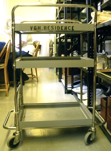Collection Nursing Equipment Collection Item Trolley with Trays, marked “VGH Residence” 998.18.1 Download Core Metadata LabelTrolley with Trays, marked "VGH Residence"DescriptionTrolley or "wagon" with three plastic trays and caster wheels, marked "VGH Residence" on one side.Sub-CollectionFurniture and Lamps Museum Information Museum Item Identifier998.18.1Accession Number998.18.1Year Accessioned1998 Continue browsing Ophthalmoscope and Otoscope with Tips Small Metal Utility Cart Back to items list