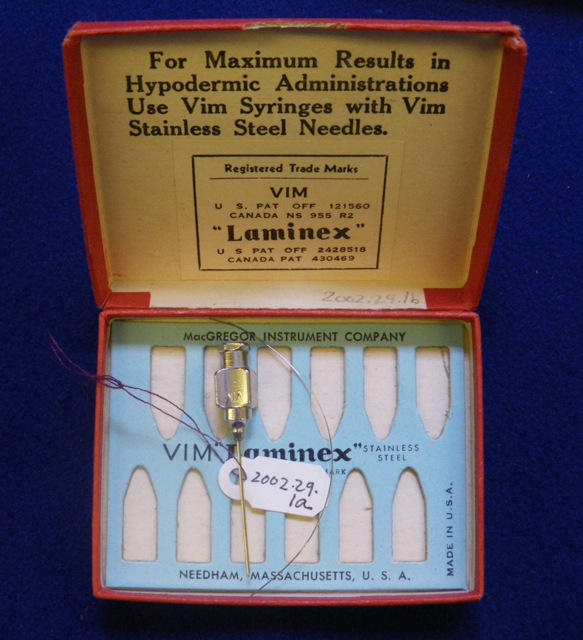 The light blue paperboard inset in the bottom of the box, designed to hold the needles in place, is labeled "MacGREGOR Instrument Company / VIM "Laminex" Stainless Steel / Needham, Massachusetts, U.S.A" and "Made in U.S.A.".